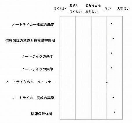 - 年2回授業(集中講義)の中で、ノートテイカーの養成をすることを始めたばかりです。まずは質よりも量の確保の段階ですが、今後フォローアップし、利用学生にとっても、テイカーにとっても成長の促進に慣れるよう努力していきたいと思います。